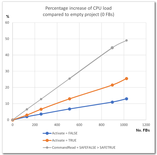 Im Messprotokoll (siehe unten) wird die CPU-Auslastung für deaktivierte FBs gezeigt (Activate = FALSE) sowie für aktivierte FBs (Activate = TRUE) und nachdem eine Anforderung zum Lesen gemacht wurde (d.h. nach einer steigenden Flanke an CommandRead).