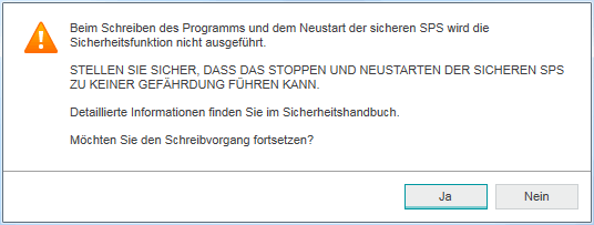 Unbeabsichtigter Betriebszustand des Geräts - Stellen Sie vor dem Schreiben des sicherheitsbezogenen Image auf die sicherheitsbezogene SPS sicher, dass die temporäre Abwesenheit der sicherheitsbezogenen Applikation und der daraus folgende Ausfall aller sicherheitsbezogenen Installationen nicht zu irgendwelchen gefährlichen Situationen führen kann.