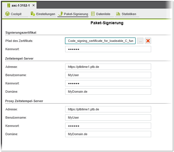 Der Signierungszertifikat-Container und das zugehörige Kennwort sind zwingend notwendig, damit die Binärdaten für das Schreiben signiert werden können. - Zeitstempel-Server (optional)Beim Erzeugen der digitalen Signatur wird dieser immer ein Zeitstempel hinzugefügt. Standardmäßig (wenn kein Zeitstempelserver angegeben ist) wird die digitale Signatur mit dem Zeitstempel des lokalen Computers versehen (aktuelles UTC-Datum und Zeit). Um einen Zeitstempel hinzuzufügen, der von einem Zeitstempel-Server (vertrauenswürdiger Dienst eines Drittanbieters) stammt, geben Sie die Serveradresse (URI des Zeitstempel-Servers) und die für die Authentifizierung verwendeten Anmeldeinformationen (Benutzername, Passwort und Domäne) ein. Wenn keine Anmeldedaten eingegeben werden, werden die Standard-Anmeldedaten verwendet.Der Zeitstempel selbst wird mit dem ausgewählten Signierungszertifikat signiert und anschließend von der Firmware der Steuerung geprüft und verifiziert. Ein entsprechender öffentlicher Schlüssel muss auch in der Trust-Liste (Liste der vertrauenswürdigen Zertifikate) enthalten sein.Der Zeitstempel stellt sicher, dass die Daten zu einem bestimmten Zeitpunkt signiert wurden (Zeitpunkt der Signaturerstellung) und seitdem nicht mehr verändert wurden. Durch die Zeitstempelung der digitalen Signatur bleibt die Signatur der Daten auch dann erhalten, wenn das Signierungszertifikat abgelaufen ist.