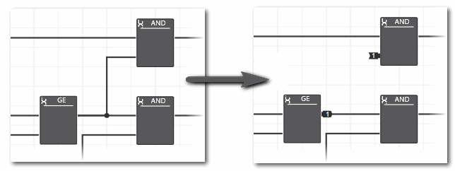 Autokonnektoren sind als schwarze Konnektorensymbole mit einer Nummer dargestellt. Autokonnektoren mit derselben Nummer gehören zusammen und ersetzen eine Verbindungslinie. Im folgenden Beispiel ist die Verbindungslinie zwischen dem Ausgang der Funktion GE und dem Eingang der oberen AND-Funktion durch Autokonnektoren ersetzt.