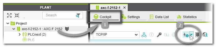 - Führen Sie den Befehl 'Projekt schreiben und starten' aus, um das Projekt-Image zu erzeugen (Projekt kompilieren), es auf die Steuerung zu schreiben und die Applikation zu starten.Der Befehl 'Projekt schreiben und starten' ist im Kontextmenü des Steuerungsknotens (ANLAGE) und im Cockpit verfügbar. Um das Cockpit zu öffnen, doppelklicken Sie in der ANLAGE auf den Steuerungsknoten und klicken im Editorenbereich auf 'Cockpit'.