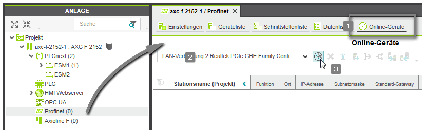 Bilden Sie Ihre Applikation in der ANLAGE ab, indem Sie Geräte einfügen. Dies kann z.B. durch Scannen des Netzwerks oder mit Hilfe des Stationseditors vorhandener Geräte in der ANLAGE geschehen.