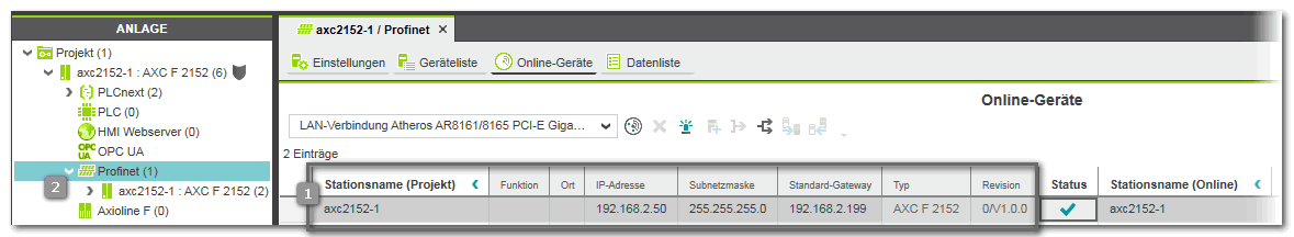 Die im gescannten Gerät konfigurierten Kommunikationseinstellungen werden in das Projekt übertragen. Die 'Online-Geräte'-Tabelle wird auf Projektseite entsprechend aktualisiert. Der 'Status' der Kommunikationsverbindung zwischen PLCnext Engineer und dem Gerät wird auf 'OK' (grün) gesetzt. Siehe (1) im folgenden Beispiel.