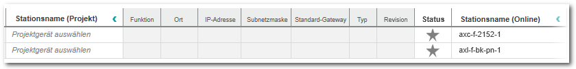 Öffnen Sie in diesem Fall die Dropdownliste 'Stationsname (Online)' in der Tabellenzeile mit der in der ANLAGE angegebenen Steuerung. Wählen Sie die Kennung der gescannten Steuerung, um sie dem Stationsnamen auf Projektseite zuzuweisen.