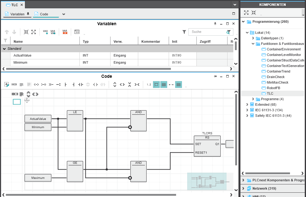 - Programmieren Sie die POEs in einer der IEC 61131-3-Programmiersprachen FBS/KOP, ST oder AS.Sicherheitsbezogener Code muss in SNKOP-Code-Arbeitsblättern programmiert werden. Dazu müssen Sie im sicherheitsbezogenen Bereich angemeldet sein.