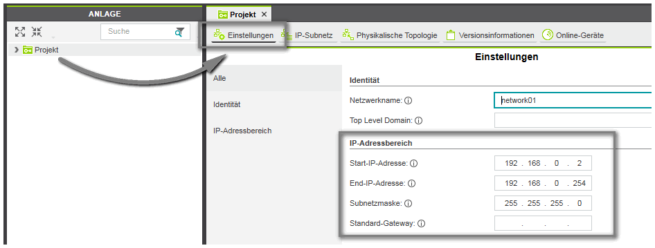 - Passen Sie den IP-Adressbereich des Projekts im 'Einstellungen'-Editor des 'Projekt'-Knotens entsprechend an, so dass er die IP-Adresse des gescannten Geräts enthält. Das gleiche gilt für die Einstellungen für Subnetzmaske und Gateway.Doppelklicken Sie auf den 'Projekt'-Knoten und öffnen Sie den 'Einstellungen'-Editor.