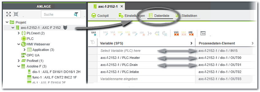 Beispiel: Zuordnung von globalen Variablen zu Prozessdaten-Elementen in der Datenliste der Steuerung