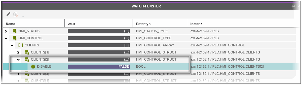 Sie können die Verbindung zwischen Client und Webserver mit Hilfe der Systemvariable HMI_CONTROL trennen (siehe unten). Der zu trennende Client wird im selben Array-Feld angezeigt wie der Client in der Struktur HMI_STATUS_TYPE (in unserem Beispiel ist dies Array-Feld [2]).