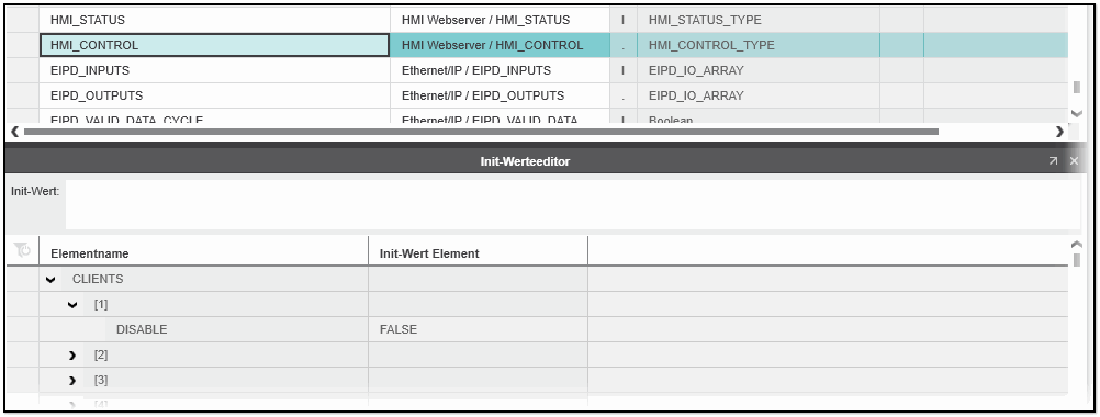 Mit Hilfe der schreibgeschützten Systemvariable HMI_CONTROL können die HMI-Clients über das Steuerungsprogramm vom Webserver getrennt werden (z.B. für Wartungszwecke). Die Variable verwendet die Struktur HMI_CONTROL_TYPE (ARRAY OF STRUCT). Diese enthält ein DISABLE-Element pro Client. Durch Setzen von DISABLE auf TRUE im Steuerungsprogramm wird der Client vom Server getrennt.