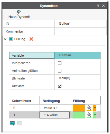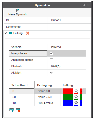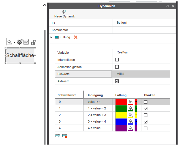 Wenn nicht auf 'Keine' gesetzt, enthält die Tabelle mit den Bedingungen/Schwellenwerten die zusätzliche Spalte 'Blinken' mit jeweils einem Kontrollkästchen für jede Bedingung. - Markieren Sie die Kontrollkästchen für die Bedingungen/Schwellenwerte, für die das Blinken aktiviert werden soll.In dem oben gezeigten Beispiel blinkt die Schaltfläche z.B. zwischen grau (aktuelle Hintergrundfarbe) und grün mit der Blinkrate 'Mittel', wenn der Wert der Variablen 'RealVar' im Bereich 1 <= Wert < 2 liegt und zwischen grau und blau, wenn der Wert zwischen 3 <= Wert < 4 liegt.