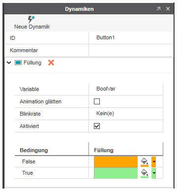 - den beiden Variablenzuständen FALSE und TRUE mit den verbundenen Fülltypen und Linienfarben (bei einer Booleschen Variablen oder einem Ausdruck, dessen Auswertung ein Boolesches Ergebnis liefert)
