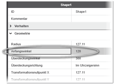 Unterer Überdeckungswinkel | Überdeckungswinkel in Grad des Bogens relativ zum statischen 'Anfangswinkel' des Kreisbogens (konfiguriert in der Kategorie 'Geometrie' des Eigenschaftenregisters), wenn der Variablenwert am unteren Ende des mit den Werten 'Unterer Bereich' und 'Oberer Bereich' festgelegten Wertebereichs liegt.