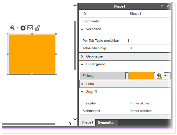 Eigenschaften werden durch Bearbeiten des Felds rechts neben der Eigenschaft geändert. Durch Klicken oder Doppelklicken auf das Eigenschaftenfeld wird ein Eingabefeld, eine Auswahlliste oder ein Dialog (z.B. zur Konfiguration der Farbe) geöffnet.