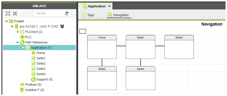 - Die Instanz einer HMI-Seite kann nur einmal hinzugefügt werden, d.h. dass eine Seite, die bereits einmal im Editor verwendet wird, kann kein weiteres Mal aus der ANLAGE in den 'Navigation'-Editor gezogen werden.
