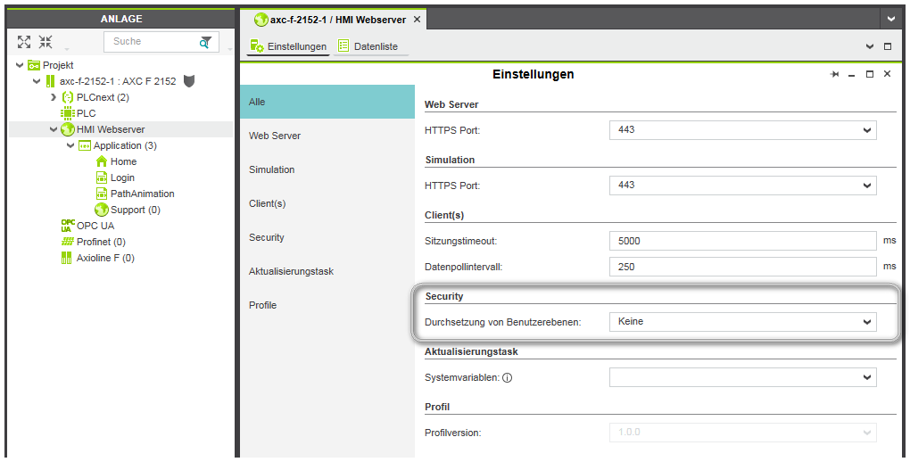 Die Security für HMI ist standardmäßig aktiviert. Das bedeutet, dass während die HMI-Applikation auf der Steuerung läuft, der Benutzer keinen Zugriff auf die HMI-Seiten und -Objekte besitzt. Um die Security für HMI zu deaktivieren, muss der Parameter 'Durchsetzung von Benutzerebenen' im 'HMI Webserver' | Editor 'Einstellungen' von 'PLCnext Benutzerverwaltung' auf 'Keine' gesetzt werden.