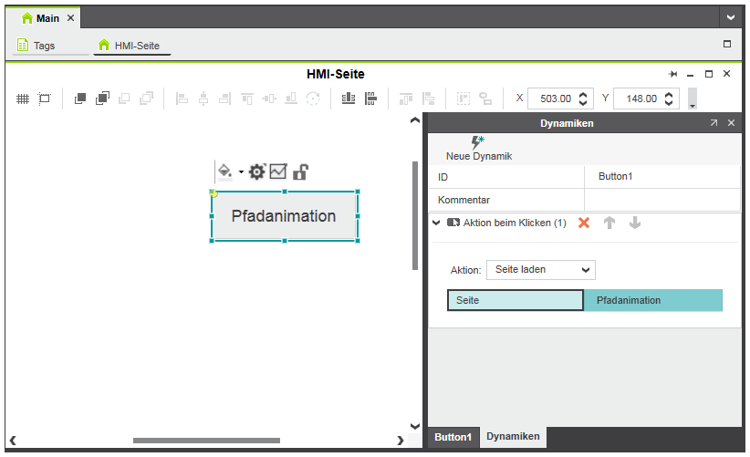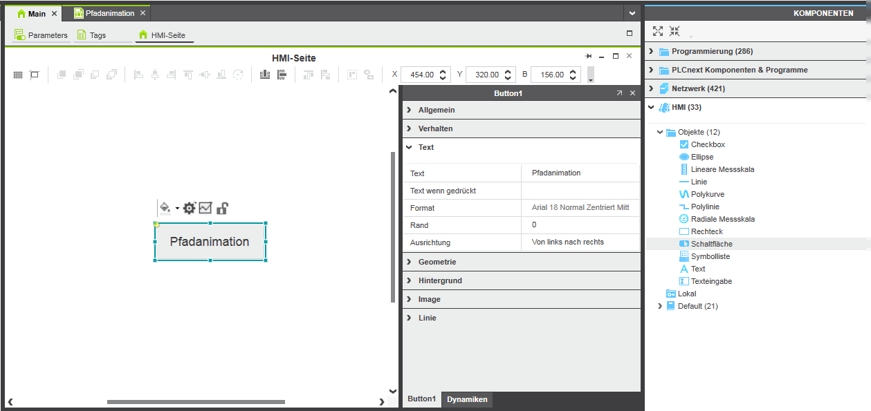 - Eine 'Schaltfläche' mit dem Namen 'Pfadanimation'. Beim Drücken dieser Schaltfläche wird die zweite HMI-Seite geladen.