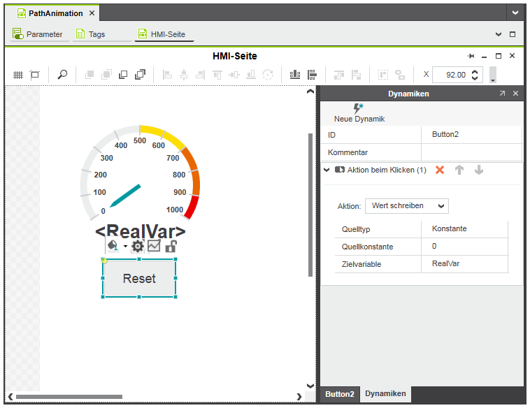 - Dynamik 'Aktion beim Klicken' mit der Aktion 'Wert schreiben' für die Schaltfläche 'Reset'. Über die Schaltfläche wird der Wert der Variablen 'RealVar' auf 0 zurückgesetzt.