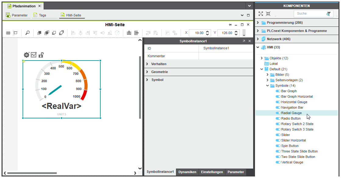 - Öffnen Sie im KOMPONENTEN-Bereich unter der Kategorie 'HMI' den Ordner 'Default | Symbole' und wählen Sie das Symbol 'Radiale Messskala' (Radial Gauge).