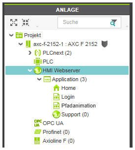 - Um eine leere HMI-Seite zum aktuellen Projekt hinzuzufügen, rechtsklicken Sie in der ANLAGE auf den Knoten 'Applikation' unterhalb des 'HMI Webserver'-Knotens und wählen Sie 'HMI-Seite hinzufügen' aus dem Kontextmenü.