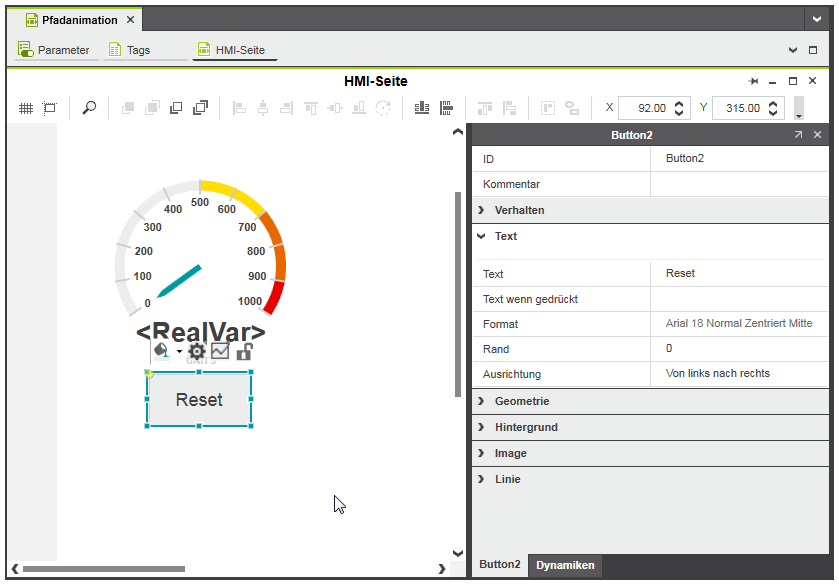 In diesem Tutorial werden Sie zwei HMI-Seiten erstellen. Auf der ersten Seite (Startseite) werden Sie eine Schaltfläche erstellen, die beim Anklicken in der Applikation die zweite HMI-Seite öffnet. Auf der zweiten Seite wird eine radiale Messskala den Wert der globalen IEC 61131-3-Variable 'RealVar' anzeigen. Mit der Schaltfläche 'Reset' wird die Variable 'RealVar' auf den Wert 0 zurückgesetzt.