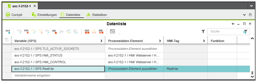 - Rechtsklicken Sie in der 'Datenliste' in die Spalte 'HMI-Tag' der Variablen 'RealVar' und wählen Sie 'HMI-Tag hinzufügen' aus dem Kontextmenü. Der Name des HMI-Tags 'RealVar' wird aus dem Variablennamen entnommen.