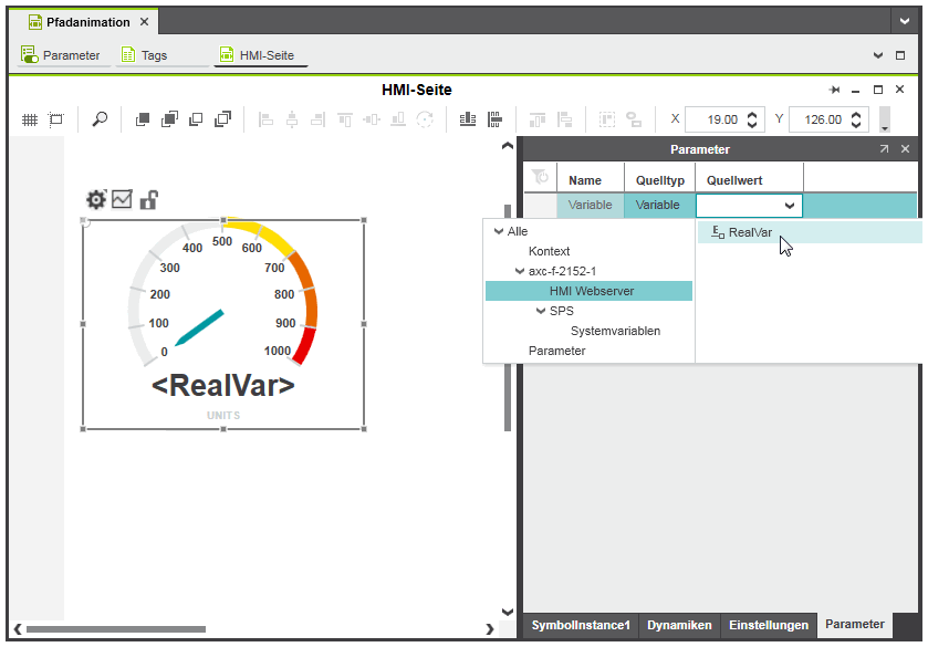 - Wählen Sie in der Dropdownliste des Listenfelds 'Quellwert' links im Baum den Eintrag 'HMI Webserver' und anschließend rechts das HMI-Tag 'RealVar' durch Anklicken oder durch Drücken von <Eingabe> aus.