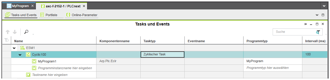- Das Projekt enthält eine Programm-POE in der Programmiersprache ST (Strukturierter Text) und die Programminstanz ist einem zyklischen Task wie unten gezeigt zugeordnet.