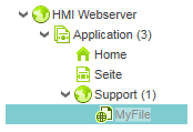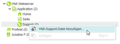 Um eine HMI-Support-Datei zum Projekt hinzuzufügen, rechtsklicken Sie den Knoten 'Support' unterhalb des 'Applikation'-Knotens und wählen aus dem Kontextmenü den Befehl 'HMI-Support-Datei hinzufügen' aus. Wählen Sie anschließend im Öffnen-Dialog die gewünschte Datei aus und klicken auf 'Öffnen'.