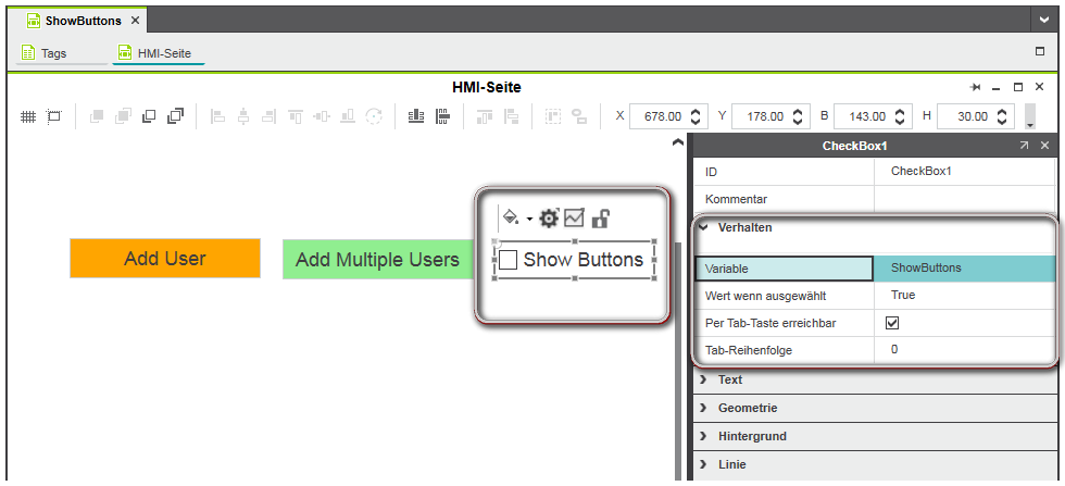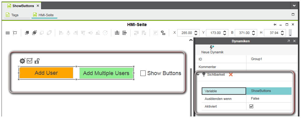 Aufgabe: Der folgende Anwendungsfall beschreibt das Konzept der lokalen HMI-Tags. In dem Beispiel wird ein Kontrollkästchen verwendet, das mit dem seitenspezifischen lokalen Tag 'ShowButtons' verknüpft ist (siehe Bild 1). Über das Kontrollkästchen kann eine Symbolleiste (Gruppe aus zwei Schaltflächen) ein- und ausgeblendet werden. Die Symbolleiste besitzt die Dynamik 'Sichtbarkeit'. Diese Dynamik ist mit dem seitenspezifischen lokalen Tag 'ShowButtons' verknüpft (siehe Bild 2).