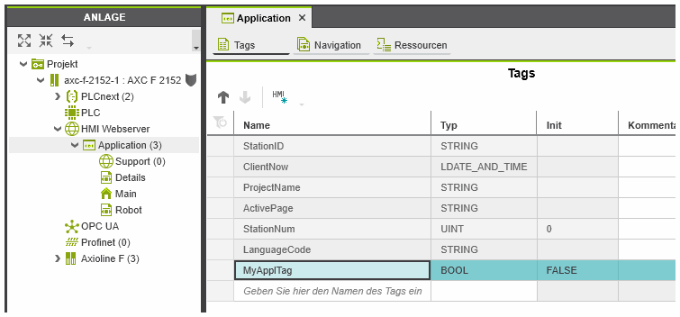 Applikationsspezifische lokale Tags: Dieses Tag ist Client-spezifisch und in allen HMI-Seiten Ihres Projekts verfügbar. Das bedeutet, das Tag ist nur für einen bestimmten Client sichtbar, kann aber in allen HMI-Seiten des Projekts verwendet werden. Applikationsspezifische lokale Tags werden beim Laden des Projekts (der Applikation) initialisiert. Die Tags werden im 'Tags'-Editor des 'Applikation'-Knotens (unterhalb des 'HMI Webserver'-Knotens) angelegt.