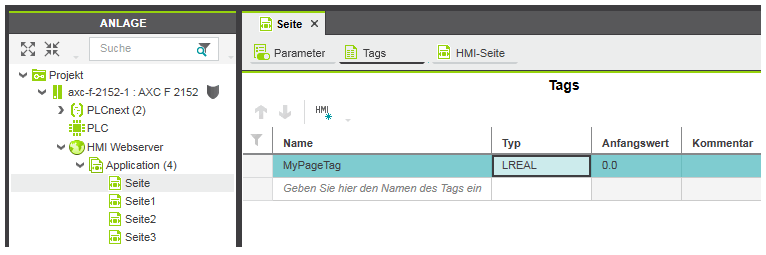 Seitenspezifische lokale Tags: Dieses Tag ist nur auf der HMI-Seite verfügbar, in der das Tag definiert ist. D.h. das Tag kann nur auf der HMI-Seite verwendet werden, welche die Tag-Deklaration enthält. Alle anderen HMI-Seiten im Projekt sehen dieses Tag nicht. Seitenspezifische lokale Tags werden beim Laden der zugehörigen HMI-Seite initialisiert. Die Tags werden im 'Tags'-Editor der HMI-Seite angelegt.