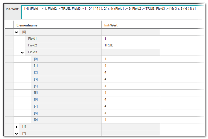 4((Field1 := 9, Field2 := TRUE, Field3 := [5(3), 5 (6)])) //Initialisieren der letzten 4 Elemente