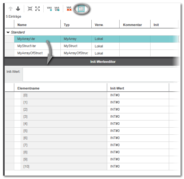 - Öffnen Sie den 'Init-Werteeditor', indem Sie aus dem Kontextmenü einer Variablendeklaration in der Variablentabelle den Befehl 'Init-Werteeditor anzeigen' auswählen oder auf die folgende Schaltfläche in der Symbolleiste der Variablentabelle klicken: