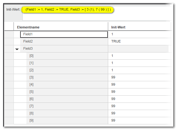 4((Field1 := 1, Field2 := TRUE, Field3 := [10(4)])),//Initialisieren der ersten 4 Elemente