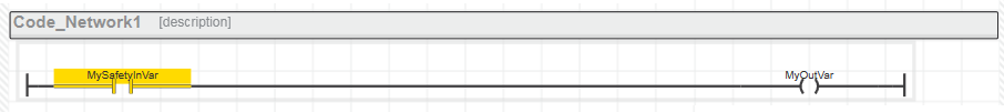 Die einfachste Realisierung des Zustimmprinzips in einem SNKOP-Netzwerk ist eine logische UND-Verknüpfung eines sicherheitsbezogenen Signals (in Form eines KOP-Kontakts) mit einem Standard-Signal (ebenfalls ein KOP-Kontakt). Dies bedeutet, die Standard-Steuerung (repräsentiert durch das Standard-Signal im Code-Netzwerk) stimmt der sicherheitsbezogenen SPS (repräsentiert durch das sicherheitsbezogene Signal) zu. Dieses Verhalten ist im ersten Beispielnetzwerk unten gezeigt.