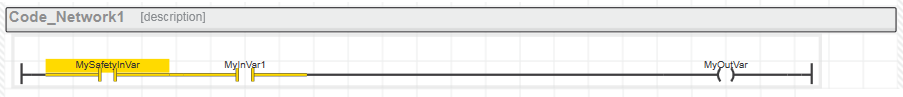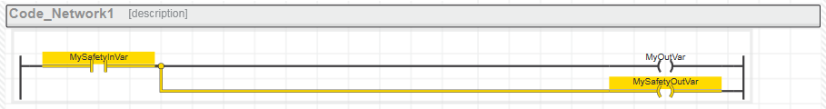 Werden sicherheitsbezogene Variablen und Standard-Variablen gemischt, führt der SNKOP-Editor eine Datenflussanalyse im Code durch. Führende sicherheitsbezogene Signalpfade eines Netzwerkes werden dabei durch dicke gelbe Linien hervorgehoben.