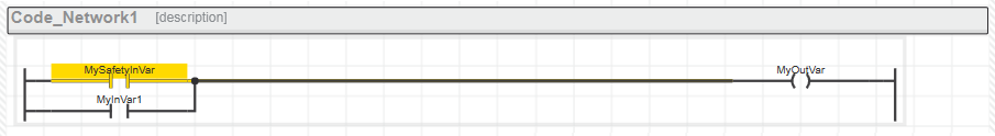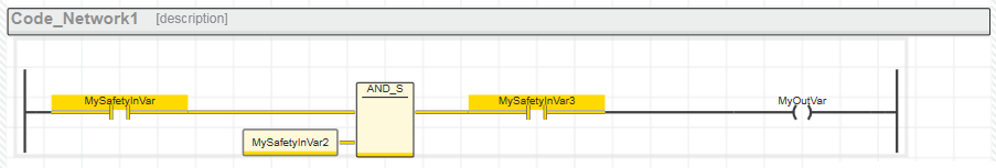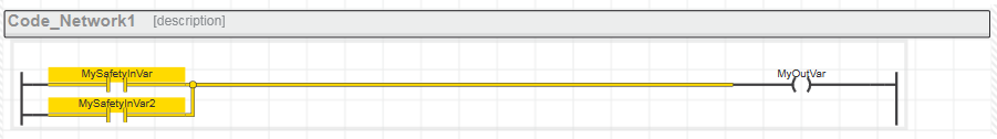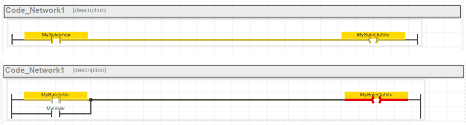In solchen gemischten Netzwerken sind UND-Verknüpfungen von sicherheitsbezogenen Variablen und Standard-Variablen sowie Datentypkonvertierungen von sicherheitsbezogen nach Standard erlaubt. Unzulässig sind dagegen Datentypkonvertierungen von Standard nach sicherheitsbezogen und ODER-Verknüpfungen von sicherheitsbezogenen Datentypen und Standard-Datentypen, wenn deren Ausgang eine sicherheitsbezogene Variable schreibt. Lesen Sie hierzu die Abschnitte am Ende dieses Themas.