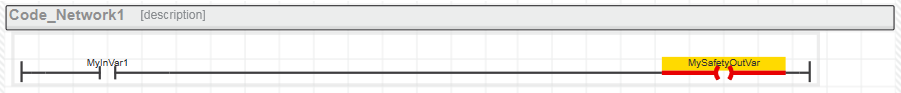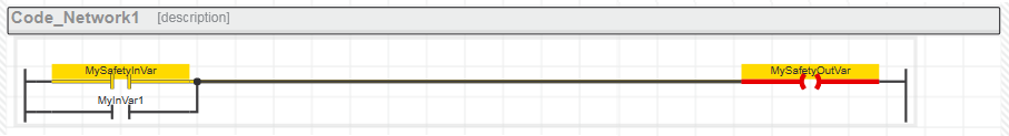 Ein sicherheitsbezogener Pfad endet immer entweder an einer sicherheitsbezogenen Ausgangsvariablen oder, im Fall einer Standard-Ausgangsvariablen, am letzten Objekteingang vor diesem Ausgang. Wenn ein Standard-Signalpfad an einem sicherheitsbezogenen Ausgang endet, dann wird dieser Ausgang rot markiert. Zusätzlich wird in der Fehlerliste eine Fehlermeldung ausgegeben (im folgenden Beispiel die Meldung "Nicht-sicherheitsbezogener Eingang schreibt auf sicherheitsbezogenen Ausgang").