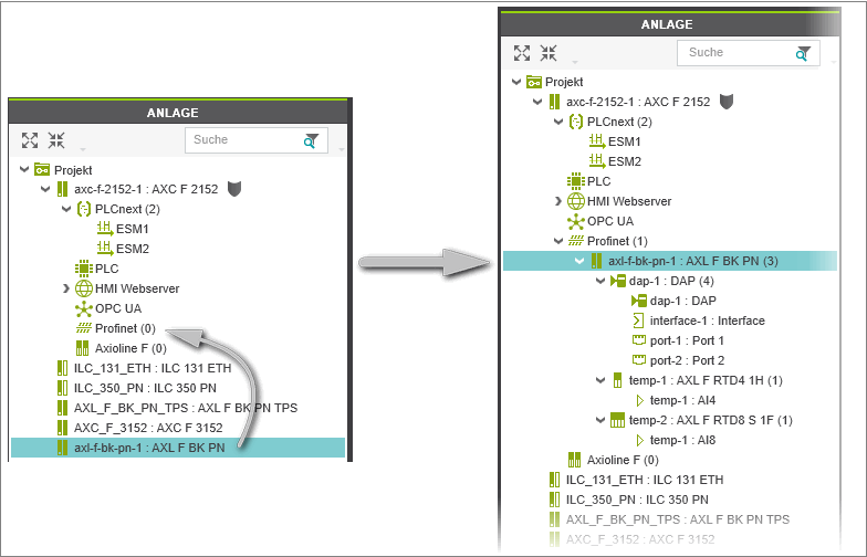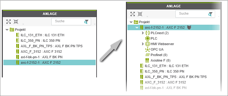 - Per Drag und Drop aus dem KOMPONENTEN-Bereich.Ziehen Sie dazu das Gerät aus dem KOMPONENTEN-Bereich auf den 'Projekt'-Knoten in der ANLAGE.