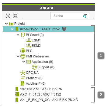 - Engineering-GeräteEngineering-Geräte sind Geräte, die Teil der aktiven Steuerungs-/Profinet-Konfiguration sind. Die aktive Steuerungs-/Profinet-Konfiguration wird als hierarchische Baumstruktur in der ANLAGE abgebildet, mit der Engineering-Steuerung als Wurzelknoten (siehe [1] in der folgenden Abbildung). Alle physikalischen und logischen Komponenten (Hardware und Software) der zu steuernden Anlage/Maschine sind Kindknoten in der Hierarchie.Nur die Geräte in der aktiven Konfiguration sind für das Engineering-Projekt relevant (enthält alle für die Applikation erforderlichen Daten wie Netzwerk- und Kommunikationseinstellungen, Geräteparametrierungen, Laufzeitkonfiguration der Steuerung usw.).