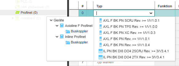- Linksklicken Sie in der 'Geräteliste' in das Feld 'Typ' mit dem Text 'Typ wählen' oder bewegen Sie den Tabellencursor mit Hilfe der Pfeiltasten auf dieses Tabellenfeld und drücken Sie die <Eingabe>-Taste.Es erscheint die Rollenauswahl zum Auswählen von Geräten. Diese zeigt links einen Baum und rechts Geräte. Es lassen sich nur Geräte auswählen, die für den aktuellen Knoten in der ANLAGE geeignet sind. Da die Geräteauswahl für das 'Profinet'-Gerät geöffnet wurde, lassen sich nun nur Profinet-Geräte auswählen.