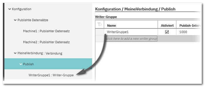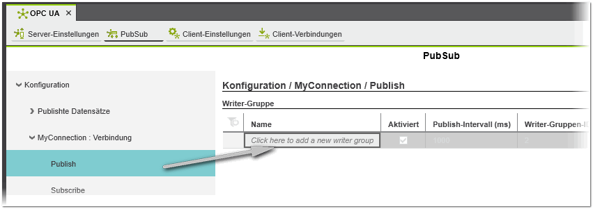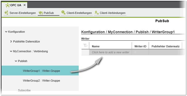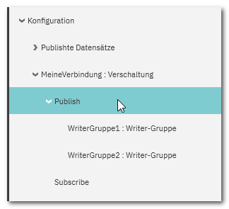 - Öffnen Sie im Baum links die Verbindung, unter der Sie Writer einfügen möchten und markieren Sie dort den 'Publish'-Knoten.