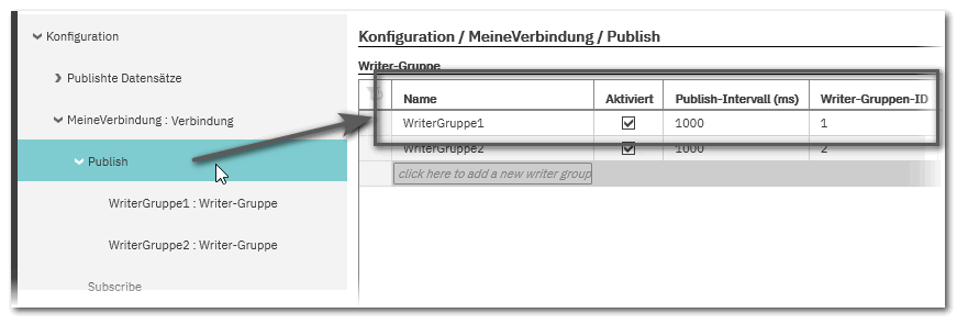 Anhand der Kombination aus Writer-ID, Writer-Gruppen-ID und Publisher-ID identifiziert ein Subscriber den Publisher, von dem er Daten lesen soll. - Fügen Sie nun Writer in die Gruppe ein und spezifizieren Sie diese.