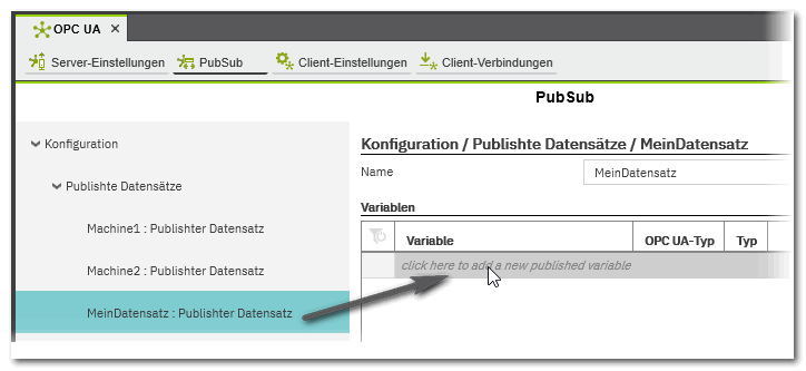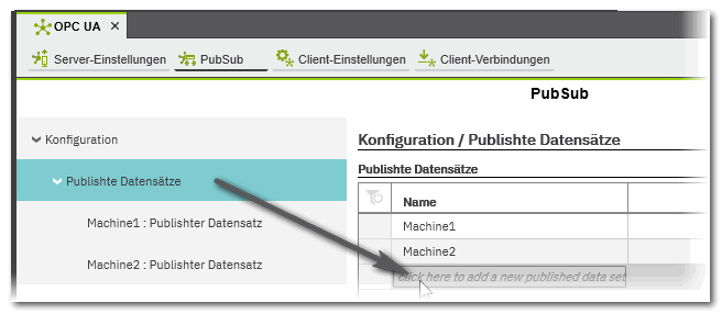 - Doppelklicken Sie in der ANLAGE auf den 'OPC UA'-Knoten und öffnen Sie den 'PubSub'-Editor.