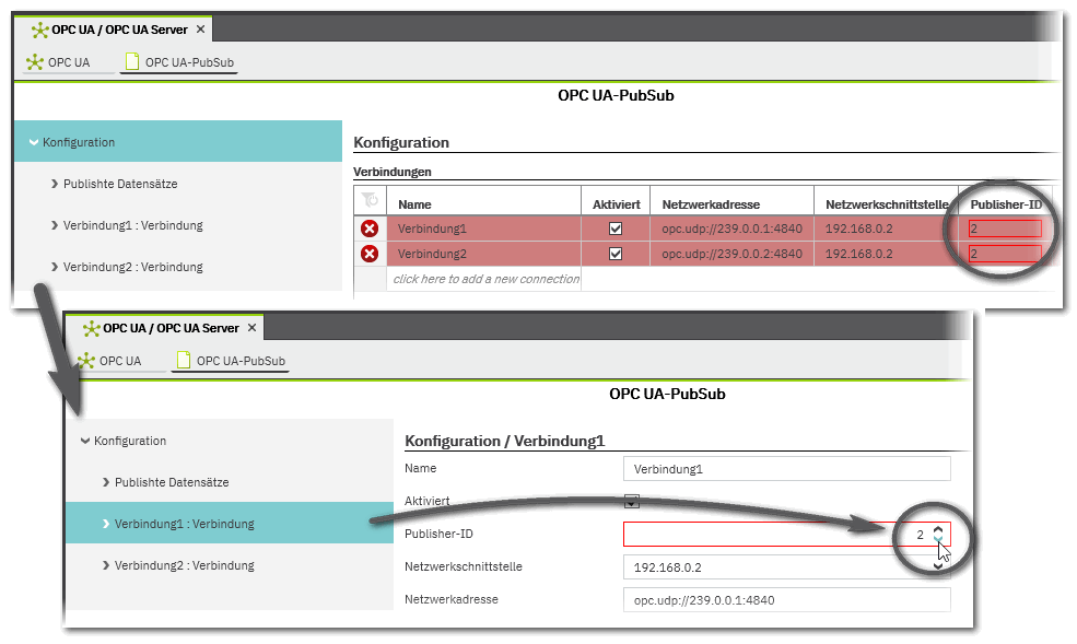 In der Konfiguration der OPC UA PubSub-Kommunikation sind mehrere Verbindungen mit derselben Publisher-ID definiert. Diese IDs müssen innerhalb einer Konfiguration eindeutig sein.
