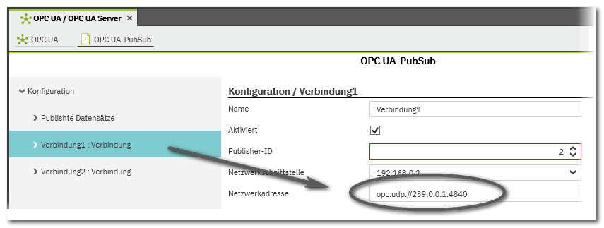 In der Konfiguration der OPC UA PubSub-Kommunikation ist in den Verbindungseigenschaften eine ungültige Netzwerkadresse angegeben. Diese Multicast-Adresse spezifiziert das Netzwerk, in das jeder Writer der betreffenden Verbindung seine Daten publisht (schreibt).