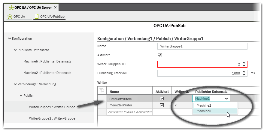 In der Konfiguration der OPC UA PubSub-Kommunikation ist im Eigenschafteneditor eines Writers ein Datensatz ausgewählt, der in der Konfiguration nicht definiert ist.