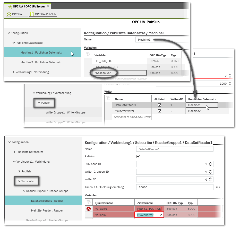 In der Konfiguration der OPC UA PubSub-Kommunikation wird eine globale Variable gepublisht (geschrieben) und subscribt (gelesen), da sie sowohl in einem Datensatz enthalten als auch als Zielvariable gemappt ist. Eine Variable kann entweder gepublisht oder subscribt werden - beide Operationen zusammen sind innerhalb einer Konfiguration nicht erlaubt.