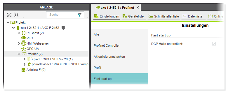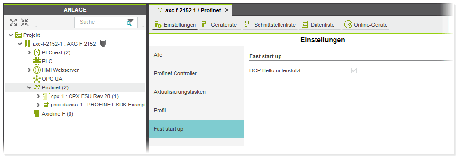 Die FSU-Funktion kann nur dann verwendet werden, wenn der im Projekt eingefügte Profinet Controller diese Funktion unterstützt. Ob Ihr Profinet Controller FSU unterstützt, sehen Sie im 'Einstellungen'-Editor des 'Profinet'-Knotens der ANLAGE. Wenn ja, enthält der Editor die Kategorie 'Fast Start up' mit aktivierten Kontrollkästchen 'DCP Hello unterstützt' (Kontrollkästchen ist schreibgeschützt).