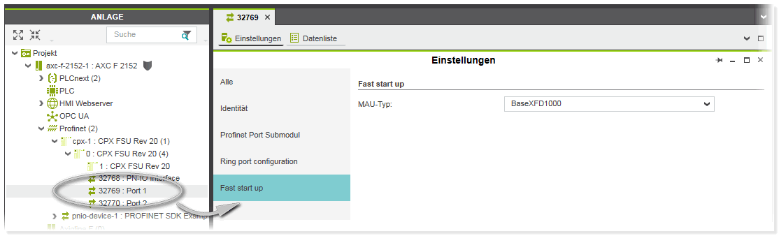 - Öffnen Sie für jeden Port, der für die Verbindung zwischen Profinet Controller und I/O-Gerät verwendet wird, den zugehörigen 'Einstellungen'-Editor. Doppelklicken Sie dazu auf den Port-Knoten in der ANLAGE. Wählen Sie auf der linken Seite des Editors die Kategorie 'Fast start up'.